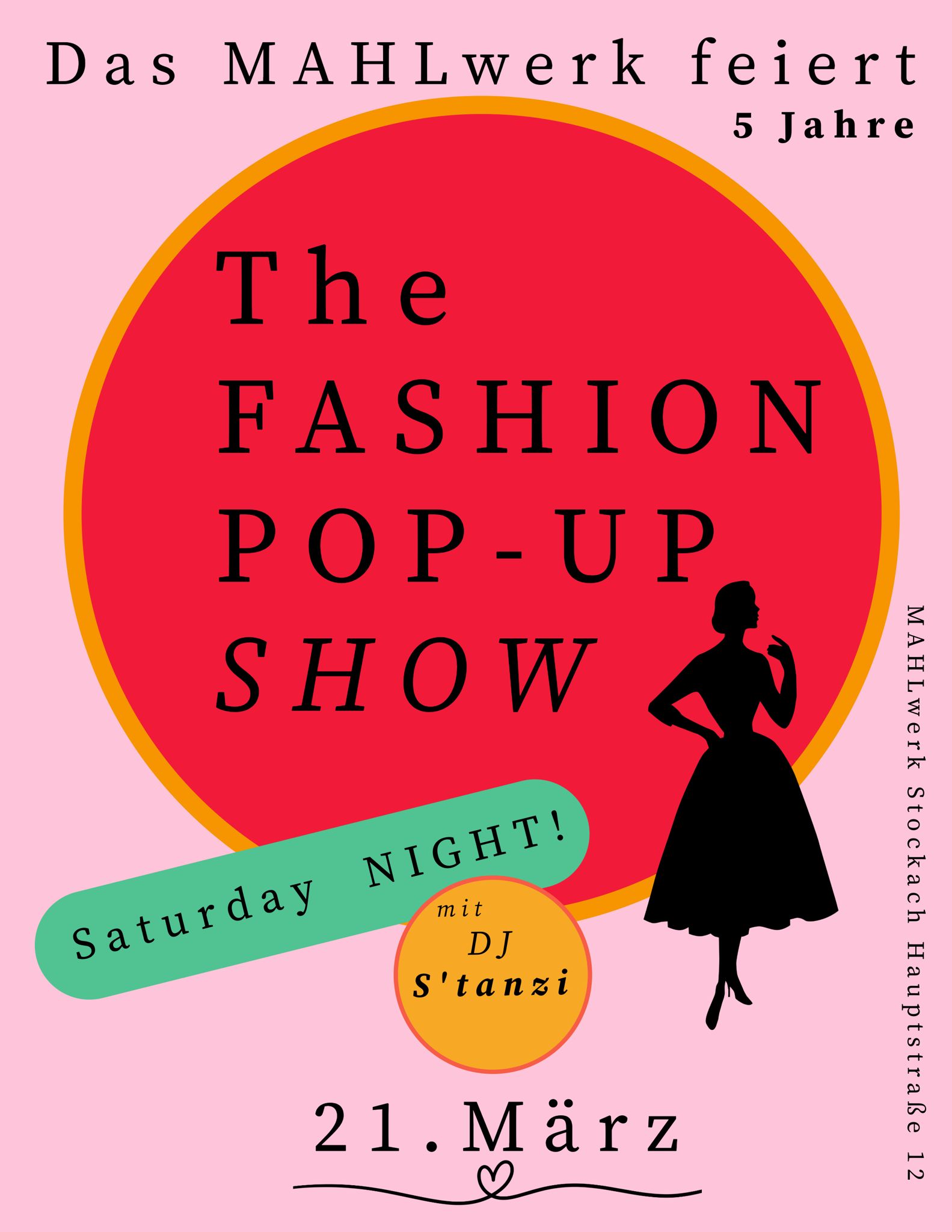 Im Zusammenspiel präsentieren das Modehaus Dorn und das Bekleidungsgeschäft Wundervoll eine kleine aber feine Modenschau, begleitet von Leckereien aus Steffis KostBar. Im Anschluss After Show Party mit DJ S'tanzi. Und dazu für alle Gäste an diesem Abend 10% für den Einkauf im MAHLwerk.